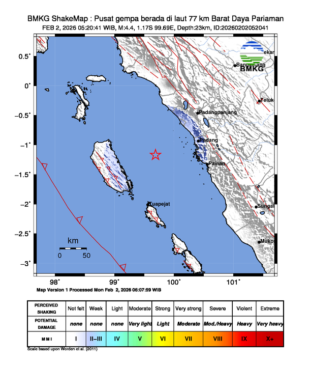 Pusat gempa berada di laut 77 km Barat Daya Pariaman
